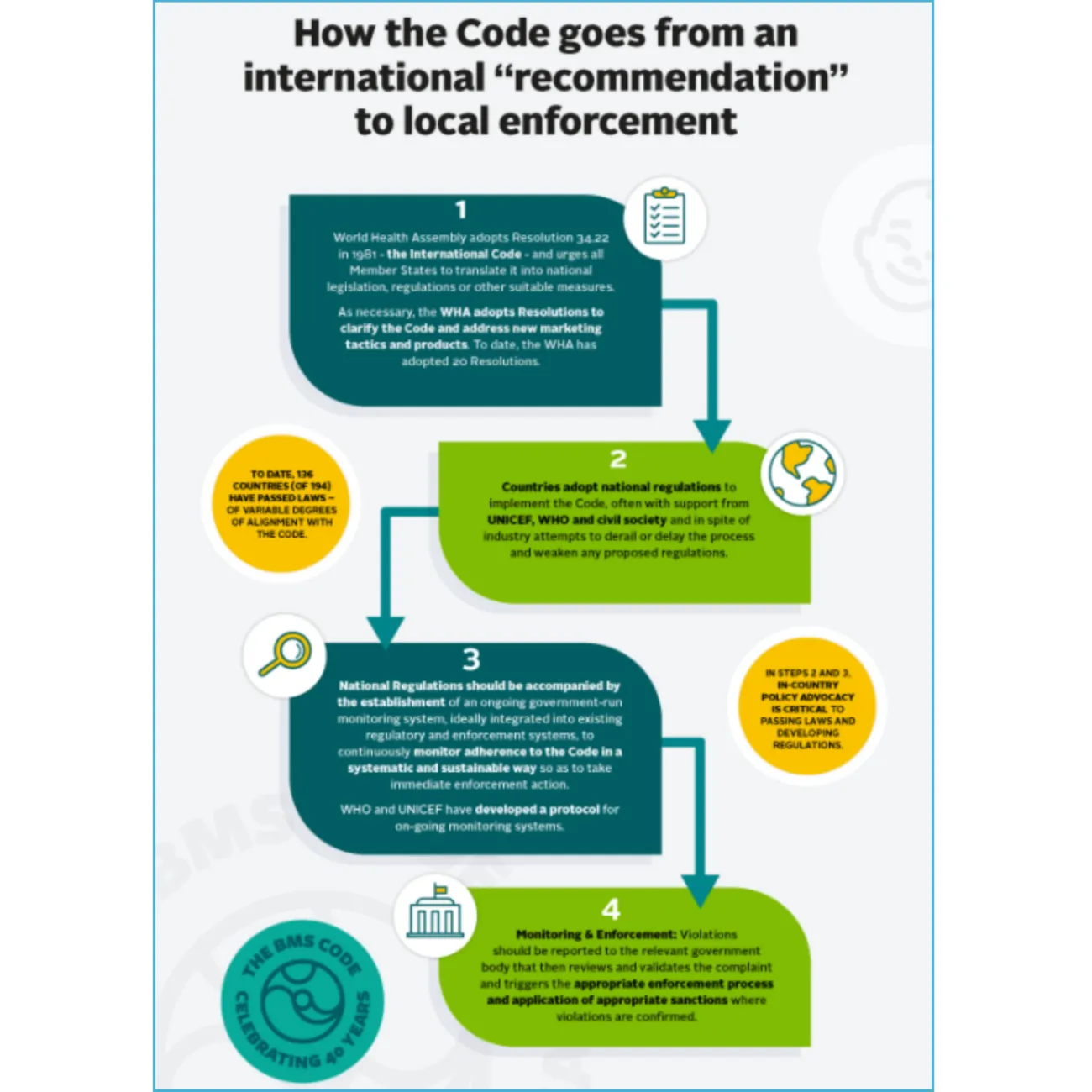 - Passing, monitoring and enforcing laws to prevent the promotion of infant formula in line with the Code, including prohibiting nutrition and health claims made by the infant formula companies